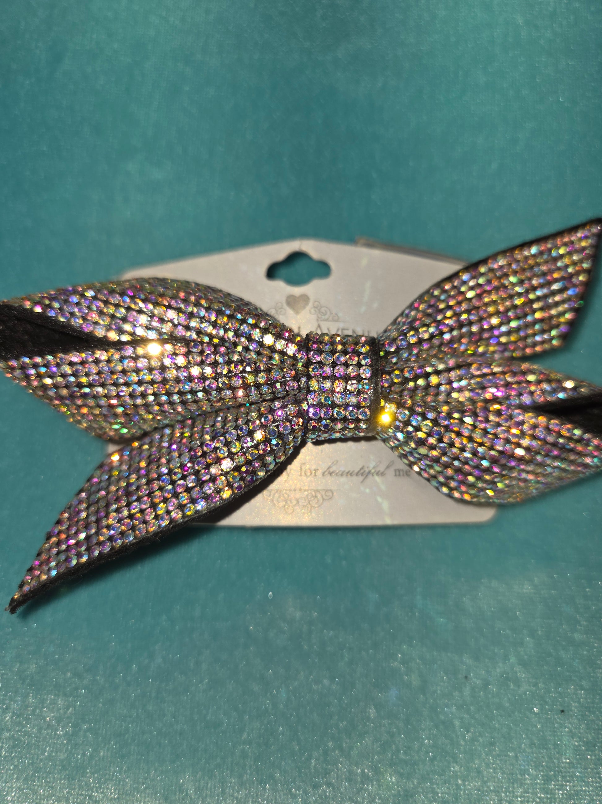 Small black clip covered in rhinestones, it's a bigger bow and very cute for date nights, on the gorgeous, or to parties.